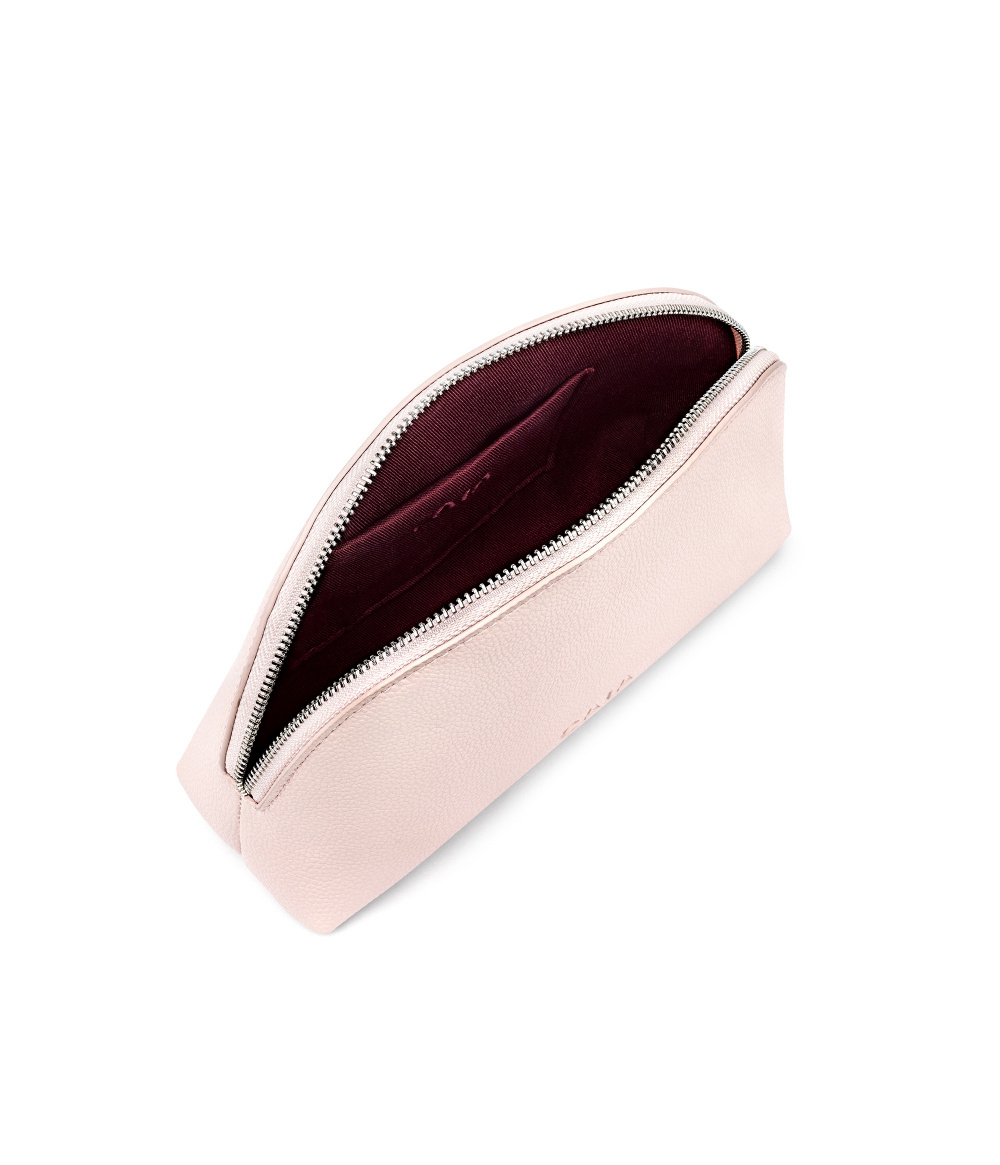 Denne toilettaske er skabt til at løfte måden, du opbevarer dine daglige beautyprodukter på. Half Moon Bag er fremstillet i blødt, struktureret vegansk PU-læder og åbnes bredt for nem adgang til din makeup. Den gennemtænkte størrelse gør, at den let glider ned i tasken og holder alt på plads. Afsluttet i en afdæmpet pastelrosa nuance med et dybt bordeauxfarvet foer gør den din daglige rutine endnu mere tilfredsstillende.